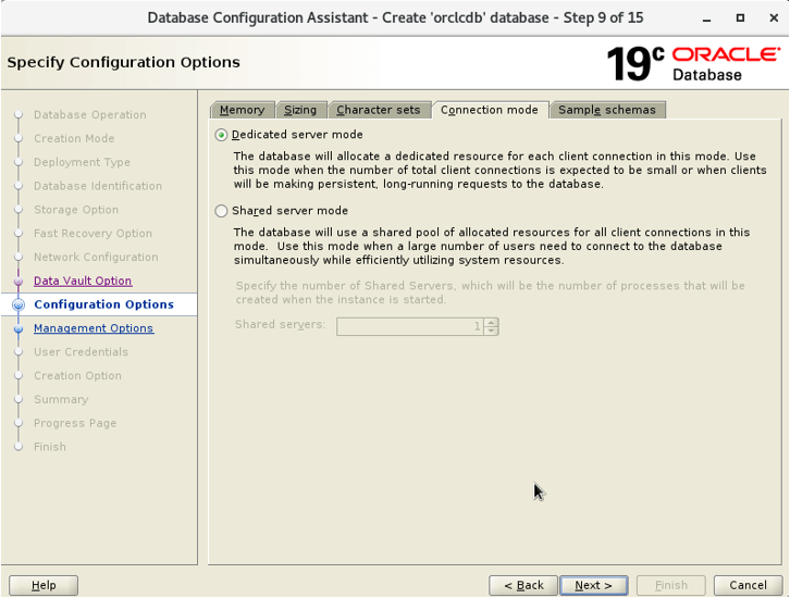dbca -silent -createDatabase \-gdbname "${ORACLE_GDB}" -sid "${ORACLE_SID}" -templateName General_Purpose.dbc -responseFile NO_VALUE \-databaseConfigType SI \-createAsContainerDatabase false \-sysPassword "<your_password>" \-systemPassword "<your_password>" \-datafileDestination "${DATA_DIR}" \-recoveryAreaDestination "${FRA_DIR}" \-enableArchive true \-storageType FS \-characterSet AL32UTF8 \-nationalCharacterSet AL16UTF16 \-redoLogFileSize 200 \-totalMemory 2300 \-memoryMgmtType AUTO_SGA \-sampleSchema true \-databaseType MULTIPURPOSE \-initParams nls_language=AMERICAN,log_archive_format=%t_%s_%r.dbf \-createListener LISTENER:1521 \-emConfiguration NONE \-ignorePreReqs