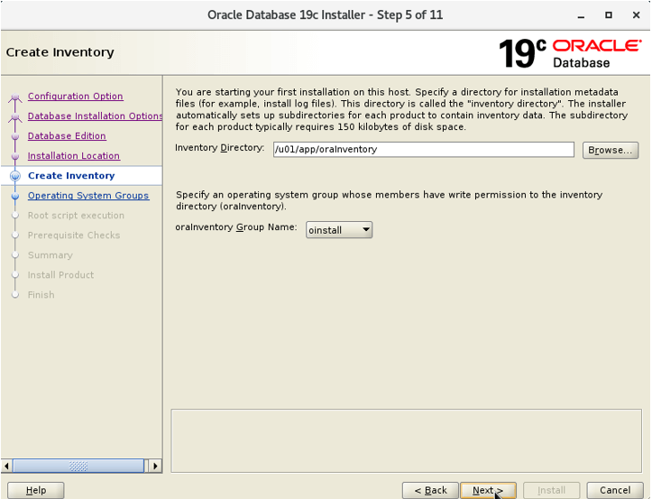 Chọn đường dẫn đến thư mục /u01/oraIventory để lưu những tệp metadata cho cơ sở dữ liệu và nhấn Next